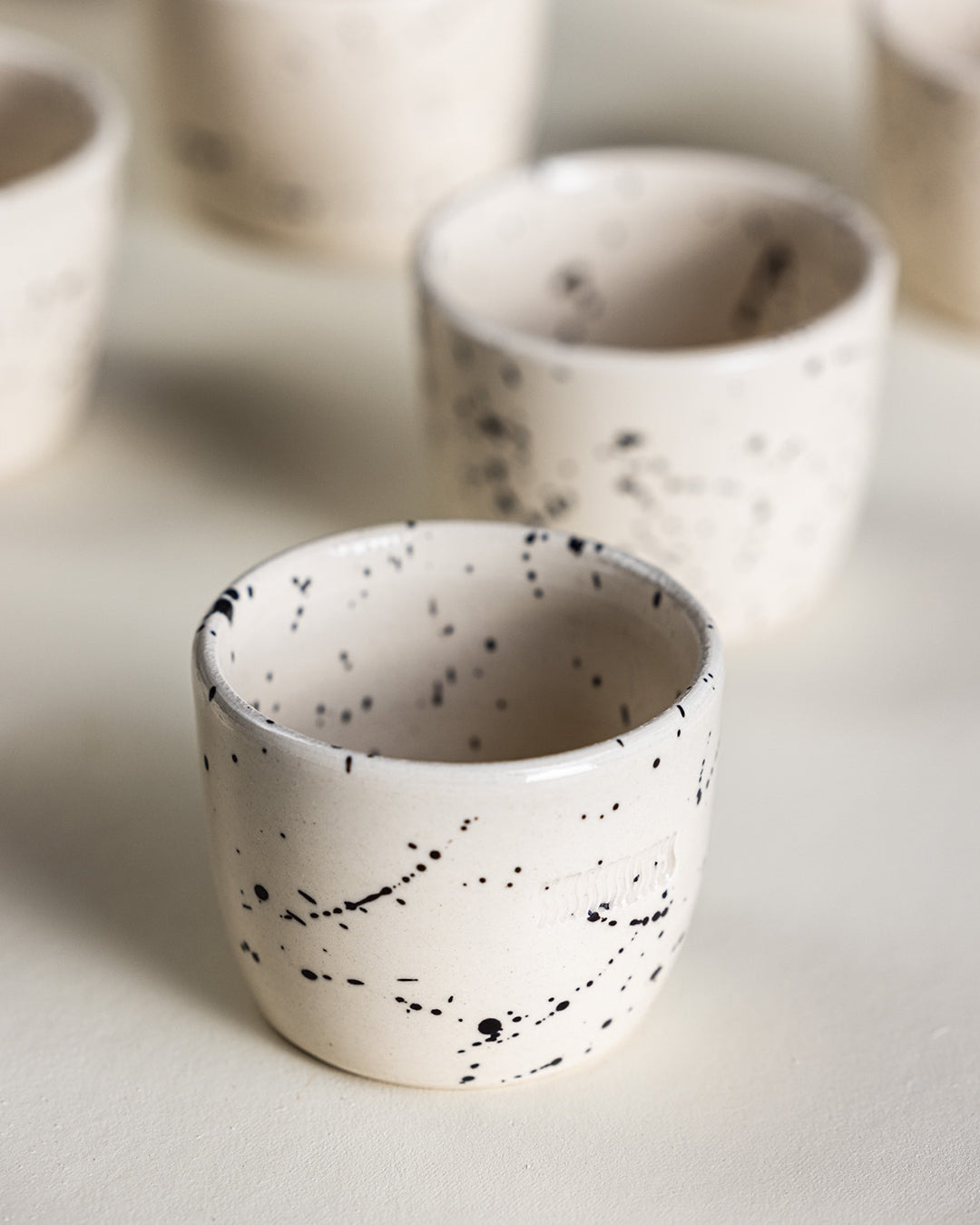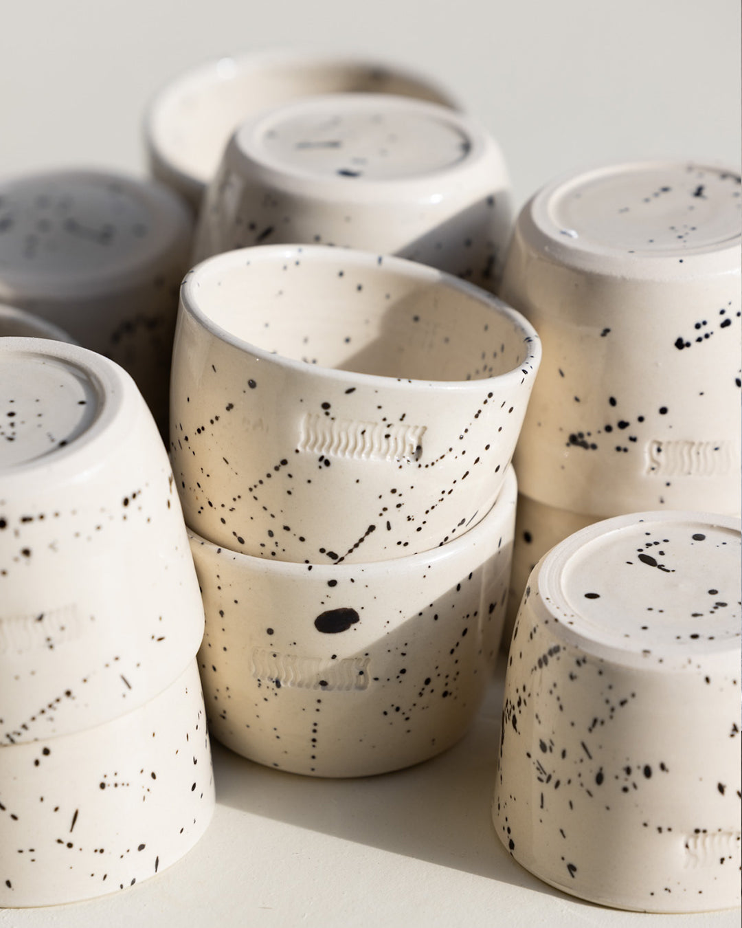 El resultado fueron tazas realizadas a torno, esmaltadas mediante una combinación de técnica de salpicado e inmersión, con un pequeño pie en su base y un acabado all over glaze que potencia su carácter artesanal.